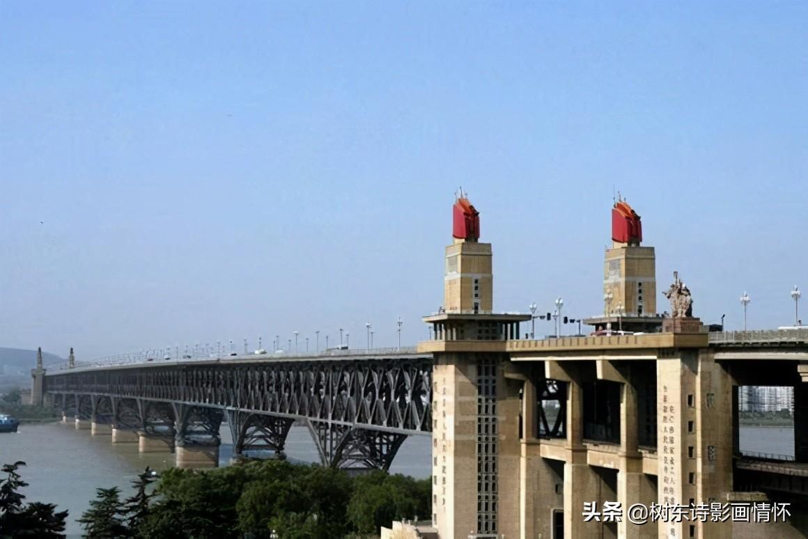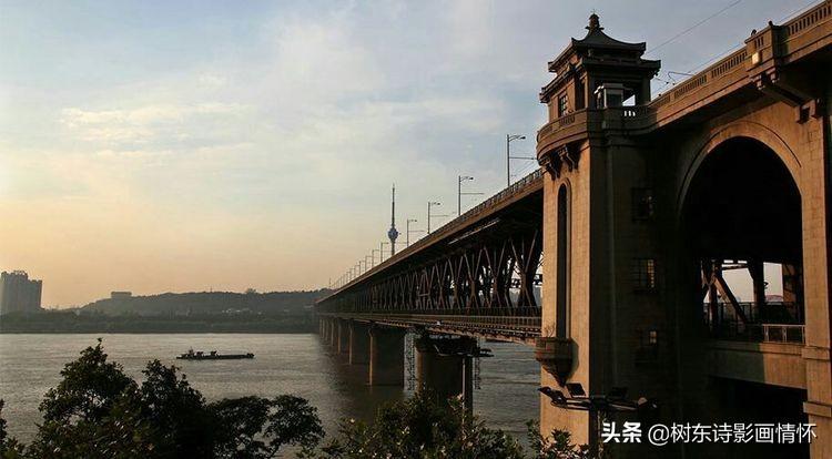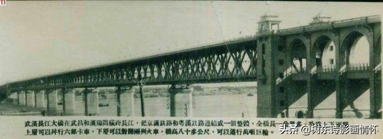 武汉长江大桥是苏联援华156项工程之一,于1955年9月动工,1957年10月15日正式通车,全长约1670米。上层为公路桥(107国道),下层为双线铁路桥(京广铁路),桥身共有8墩9孔,每孔跨度为128米,桥下可通万吨巨轮,8个桥墩除第7墩外,其它都采用“大型管柱钻孔法”,这是由我国首创的新型施工方法,凝聚着我国桥梁工作者的机智和精湛的工艺。武汉长江大桥将武汉三镇连为一体,极大地促进了武汉的经济社会发展。同时,大桥串起被长江分隔的京汉铁路和粤汉铁路,从而形成了完整的京广铁路,对促进中国南北经济的发展起到了重要的作用。1956年6月毛泽东题写的“一桥飞架南北,天堑变通途”,正是对武汉长江大桥沟通中国南北交通这一重要作用的真实写照。