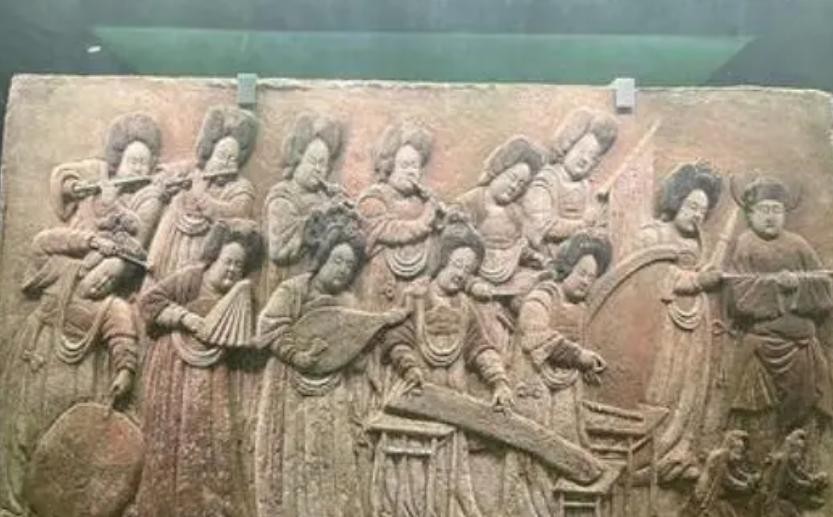 上世纪90年代,河北出土来看一块精美石雕,石雕上刻画着12个乐坊女子,她们高低错落的坐在凳子上弹奏乐器。