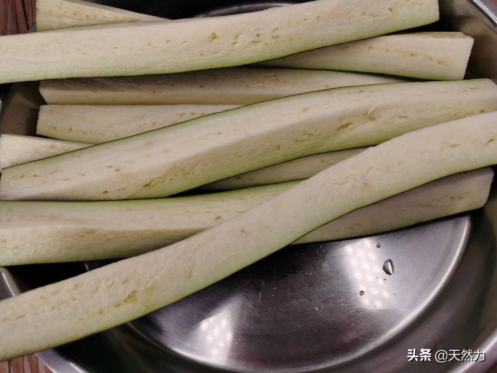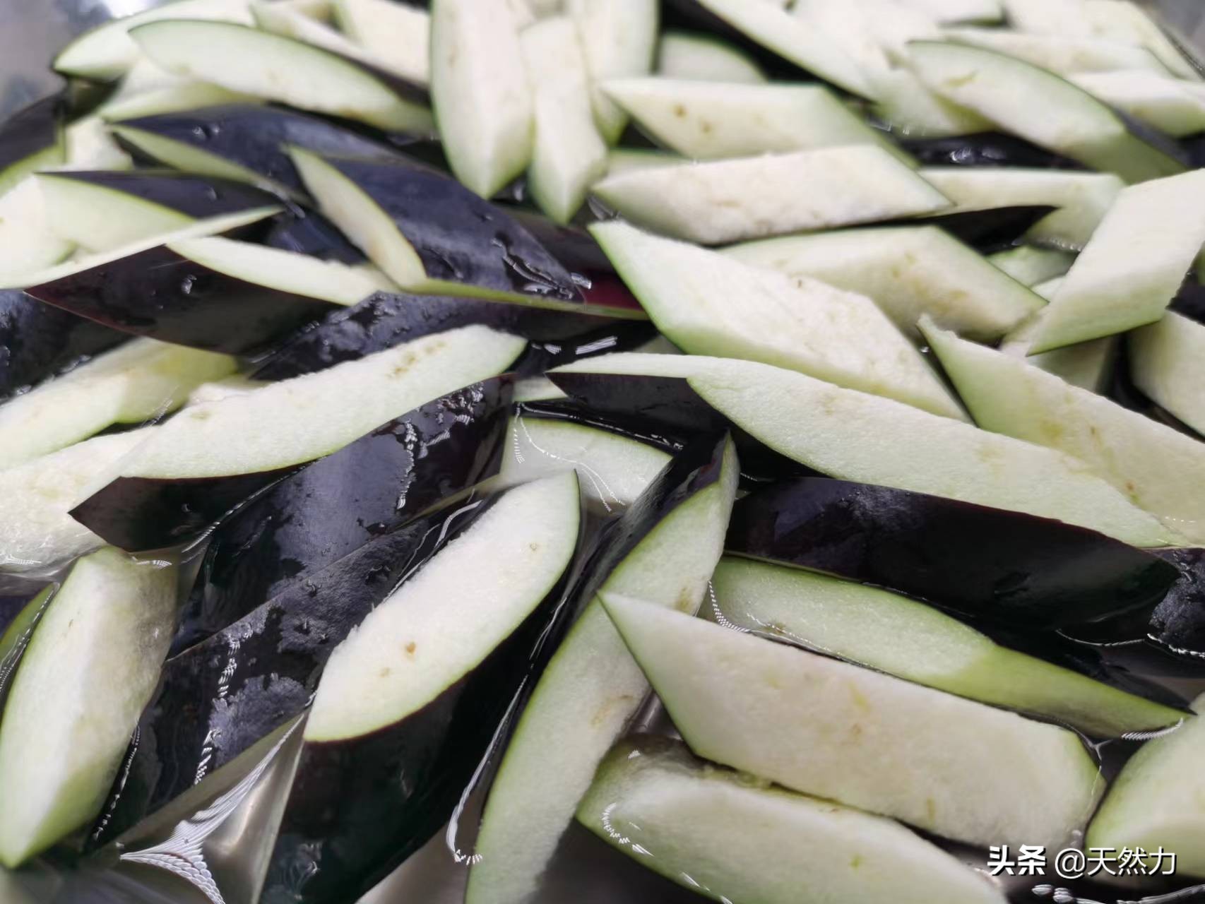 8、接着把切好的茄子用水清洗一下,洗茄子的目的就是让茄子的表面粘上清水,为拍粉做好准备,这样拍上去的粉才能挂得住在茄子的表面。洗好后把水沥掉倒入一个大盘内。