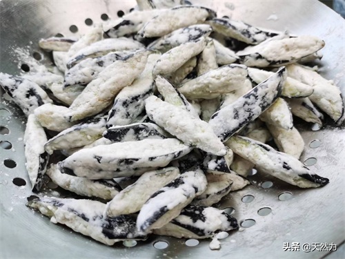12、如此3次操作,茄子就均匀地,牢固地挂上了淀粉,这时的茄子应该是完全地被淀粉给包裹了,相互也不会有粘连的现象,然后把茄子倒进漏勺,把挂好粉的茄子过筛,把粘得不牢靠的淀粉过筛掉。然后放在一旁备用。