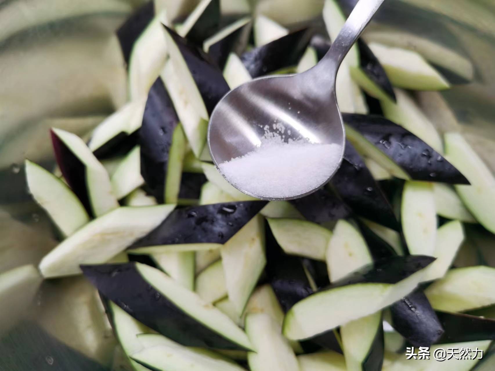 9、在茄子上面均匀地撒上2克食用盐,先让茄子入一个底味,要不然挂上粉炸好的茄子就很难入味了,加进去的盐不能多,稍微有点盐味就可以,然后把盐和茄子充分搅拌均匀,让每一片茄子都能沾上盐。