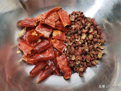 4、准备3克花椒,6个干辣椒备用,干辣椒用剪刀剪成小段,不喜欢辣的可以不加或者少加,这个完全可以根据自己的口味来增减。