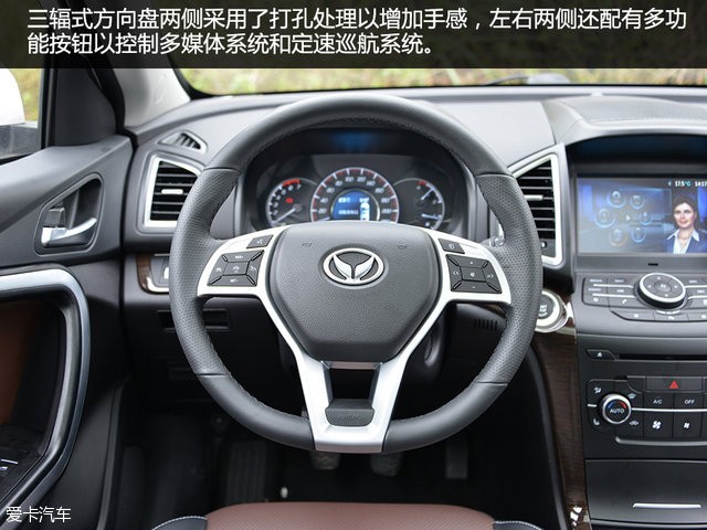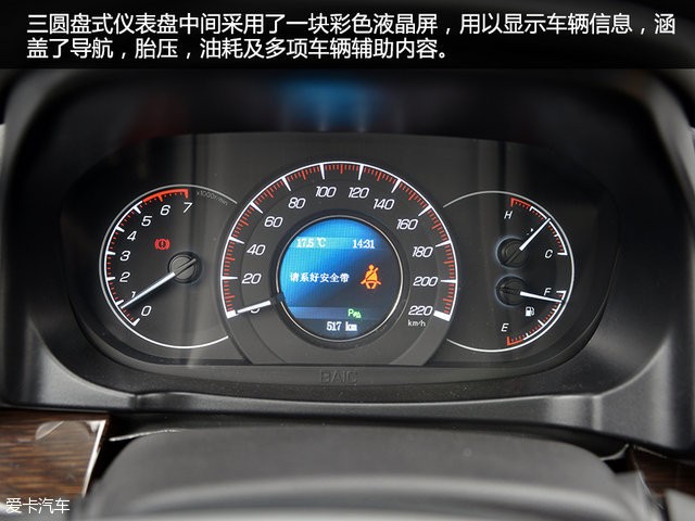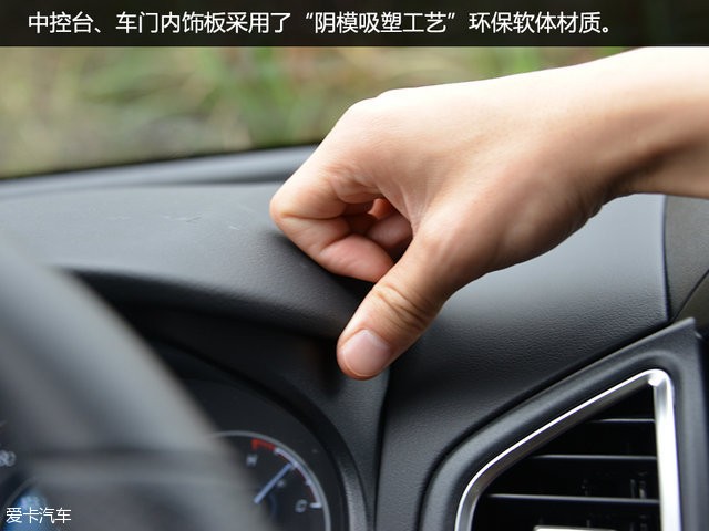 内饰的设计较为简洁,功能区的布局也非常顺手,中间的T字形中控还采用了两条仿木纹装饰点缀,中控台、车门内饰板采用了“阴模吸塑工艺”环保软体材质,整体营造出了较为不错的家用氛围。三圆盘式仪表盘中间采用了一块彩色液晶屏,用以显示车辆信息,涵盖了导航,胎压,油耗及多项车辆辅助内容。