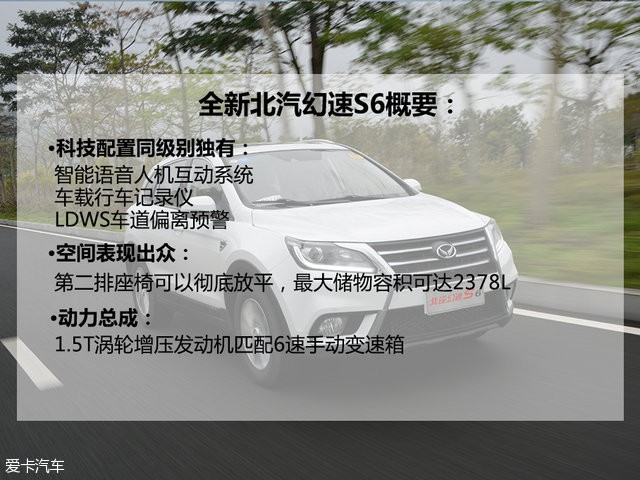 北汽幻速S6正式上市车型售价(万元)1.5T 5MT 时尚型7.981.5T 6MT 风尚型8.881.5T 6MT 领先型9.681.5T 6MT 智能型10.581.5T CVT 畅享型9.881.5T CVT 乐享型10.681.5T CVT 尊享型11.68爱卡汽车网制表 www.xcar.com.cn