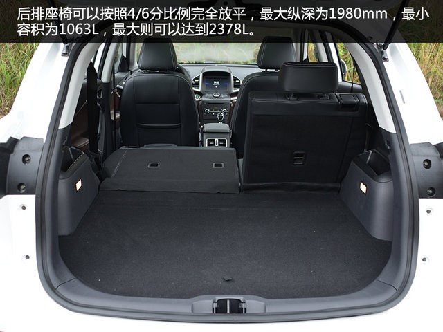 后排座椅可以按照4/6分比例完全放平,最大纵深为1980mm,最小容积为1063L,最大则可以达到2378L。