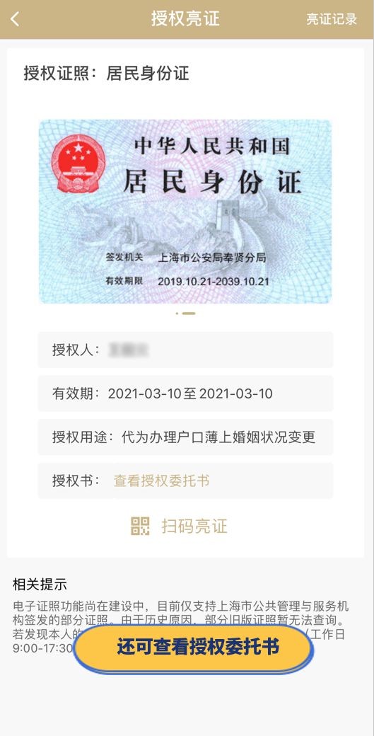授权成功,受托人可查看授权人电子证件及生成的《自然人授权委托书》