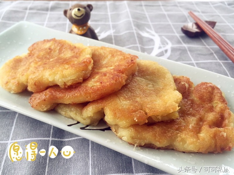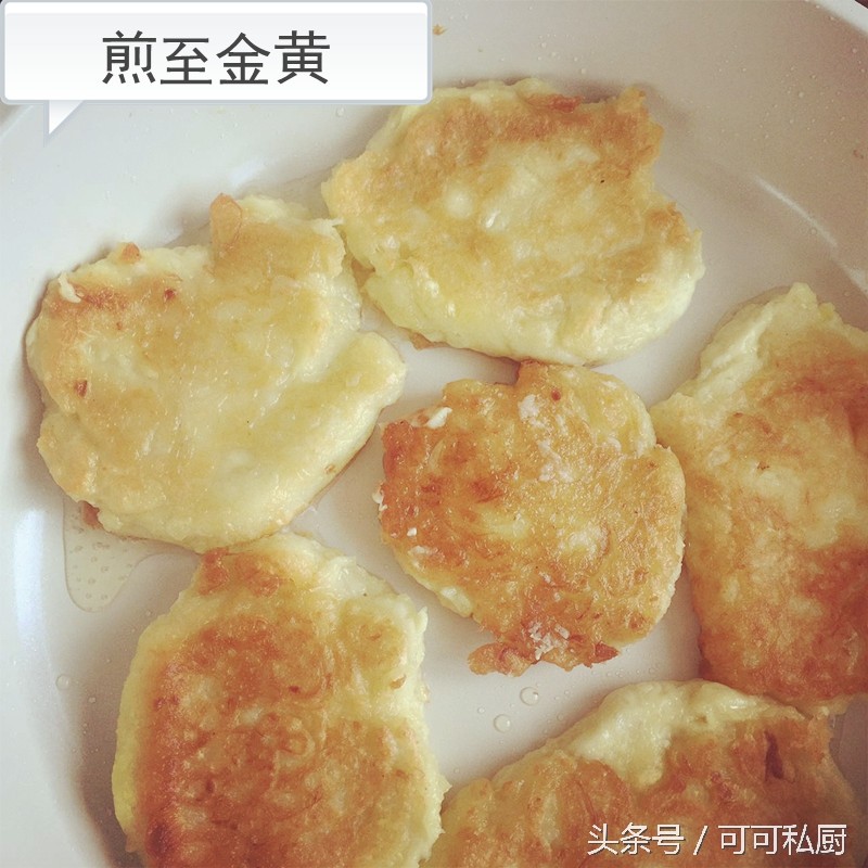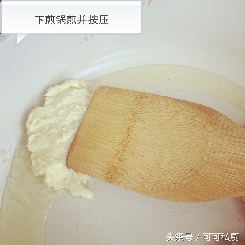 4、用勺子挖一勺下平底锅煎,煎的时候稍微按压。
