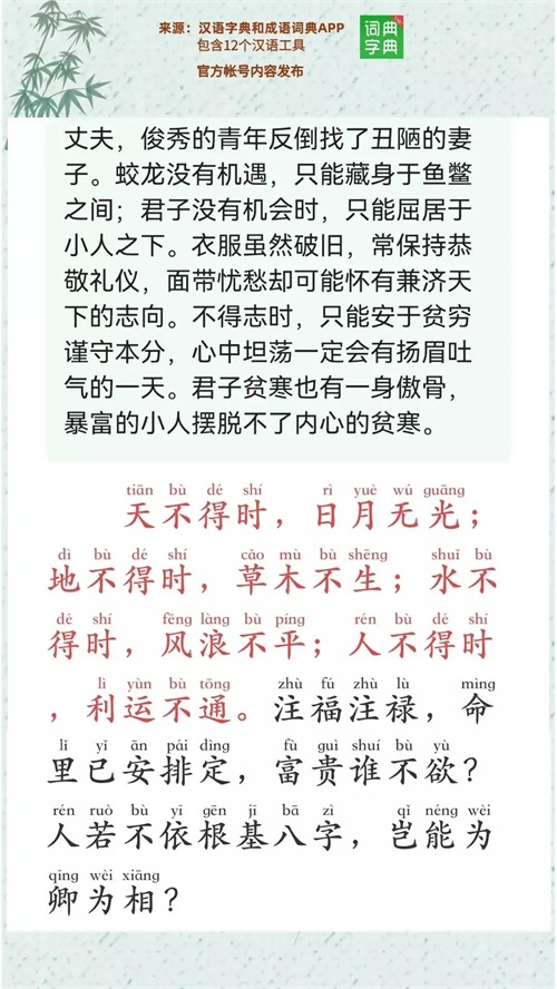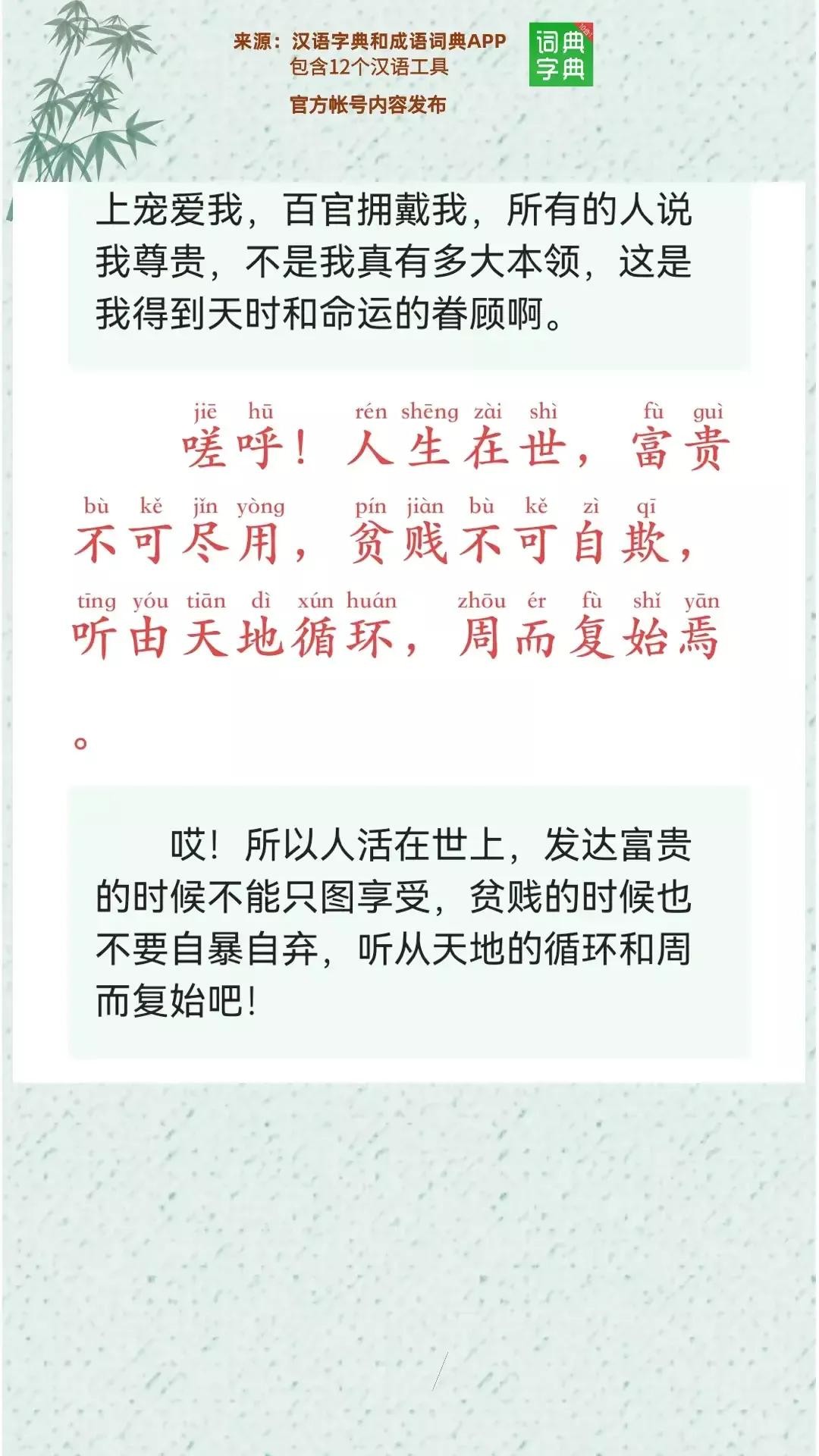 《寒窑赋》号称三大骈体文之一,本文悟透了人生命运和天地自然变化的循环规律。“人道我贵,非我之能也,此乃时也、运也、命也”。