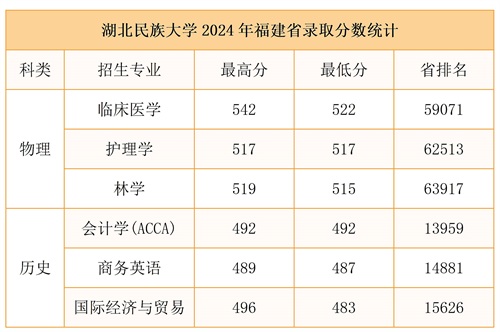湖北民族大学2024年在福建省招生类型是普通类本科批,其中物理组录取最高分542(省排名45791),录取最低分515(省排名63917);历史组录取最高分492(省排名13959),录取最低分483(省排名15626)。