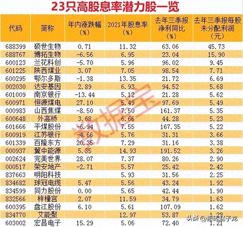 我按照2021年股息率超过5%,去年三季报净利润增速超过20%,当下尚未披露年报的原则,共挑选出了23只高股息率潜力股,它们延续高分红的概率很高。名单仅供参考,不构成任何买卖依据,请注意投资风险。喜欢的朋友可以结合自己的选股标准,来寻找部分个股的投资机会。