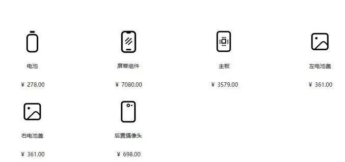 其中电池更换278元、更换/维修主板3579元、更换/维修左右电池盖361元,更换/维修后置摄像头698元。