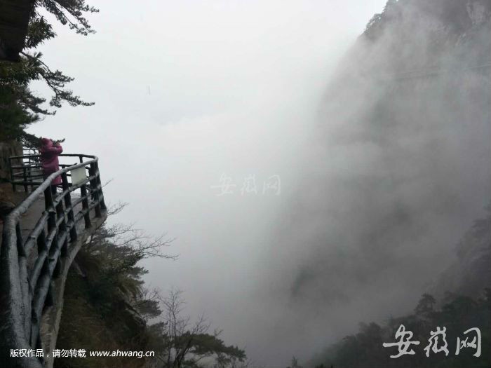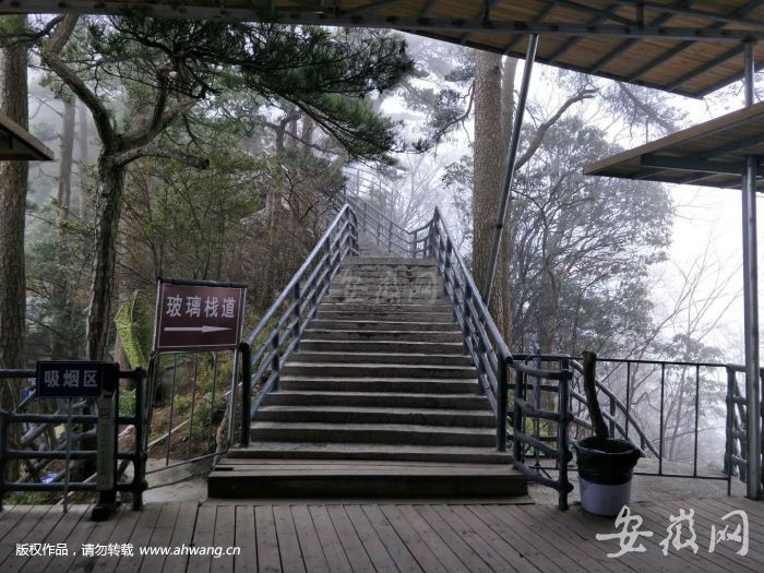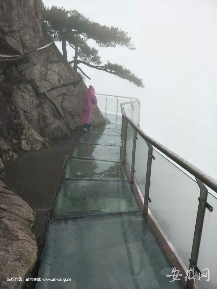 据景区工作人员介绍:明堂山高空玻璃栈道长130米,位于神女峰,使用两层钢化玻璃,透过玻璃就能看到垂直的山体,仿佛置身于空中。今日下午4点多,新安晚报、安徽网、大皖客户端记者探访此处的玻璃栈道,此时附近区域正在下小雨,白茫茫的云雾萦绕在明堂山景区,在玻璃栈道上仿佛置身于仙气缭绕的“仙境”中,令人倍感新奇。