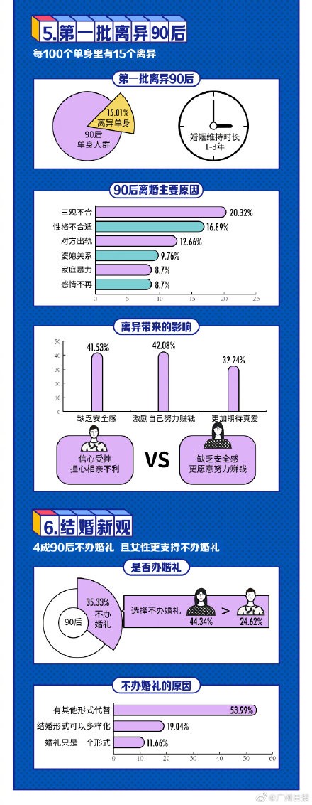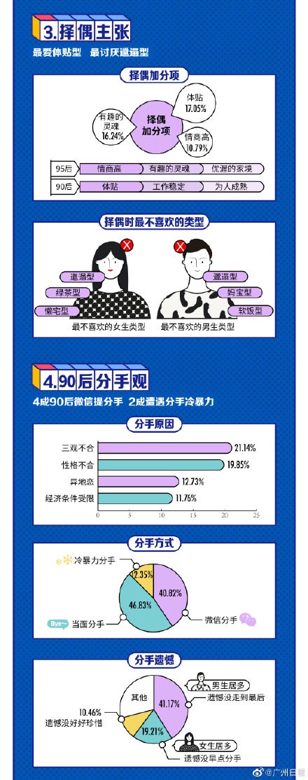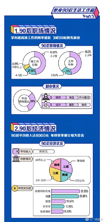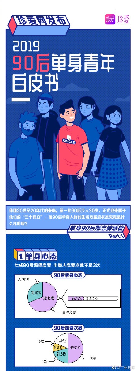 90后单身人群白皮书第一批90后即将三十岁, @珍爱网 发布90后单身人群白皮书 深度解读已近而立之年的90后单身人群的生活及婚恋状态,报告显示,七成90后渴望恋爱;4成90后微信提分手,2成遭遇分手冷暴力;每100个单身里有15个离异;学历越高换工作的频率越低;3成90后拥有副业;90后平均收入达8000元 ,年终奖孝顺父母为首选;2019年度三大困扰:单身、穷、没朋友;90后的“三十而立”:事业稳定发展、金钱财富积累、对未来有明确规划。