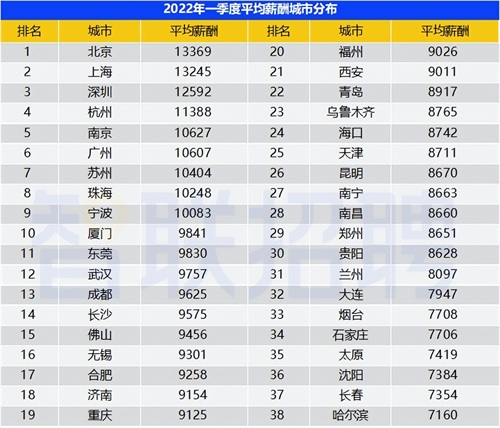 2022年第一季度,全国38个核心城市,平均薪酬达到10014元/月, 环比下降1%。其中根据智联招聘发布的信息来看:北京的平均工资高居榜首,达到13369元。相信很多人的工资都没有达到这个值,要不说是平均工资呢,谁还不被平均平均呢,毕竟工资高的人大有人在。