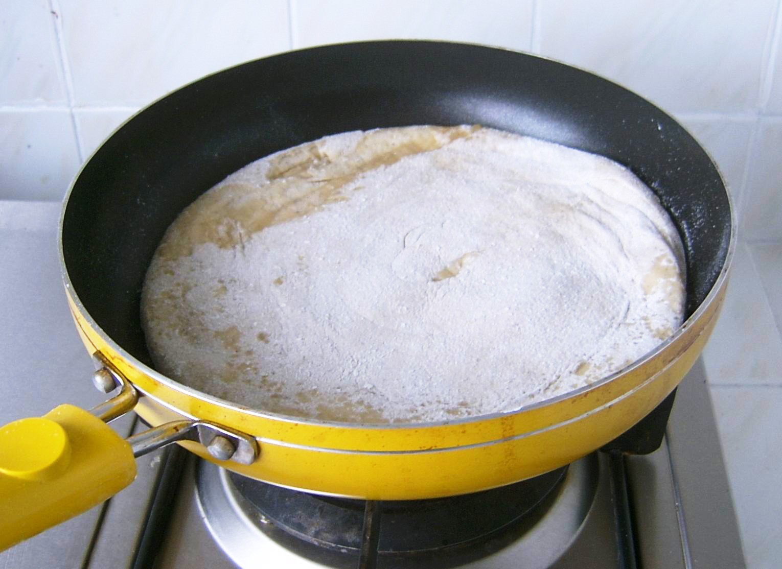 2、油150克,倒入锅中,加热到冒烟,端离炉火,慢慢倒入面粉中迅速搅拌均匀,即是油酥,做饼时,擀薄面皮,用刷子均匀刷上油酥即可。