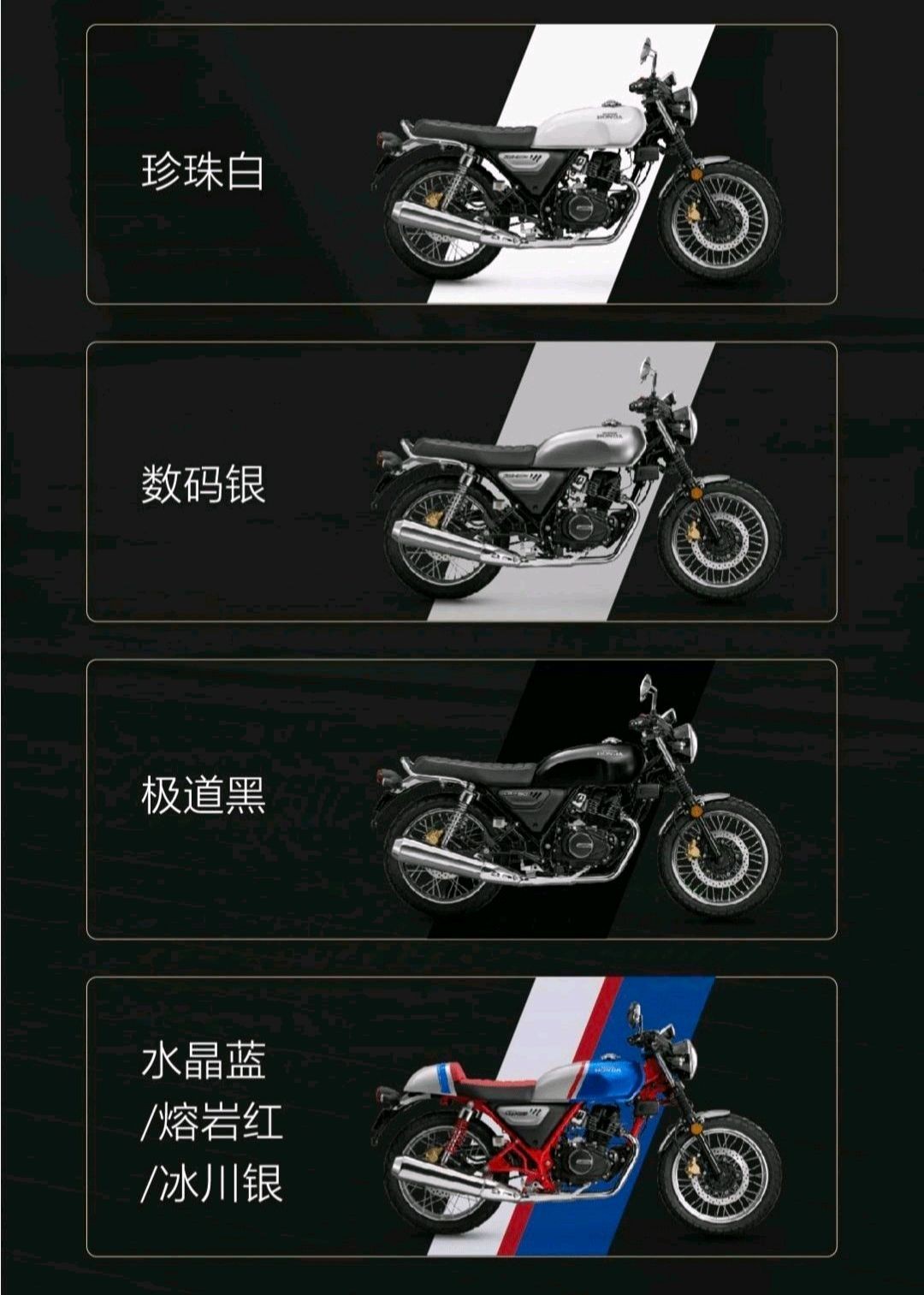 五羊本田发布了3款新车型,其中,标准版售价为10080元,边包版售价10580元,特别版售价11580元。2024款CGX150的3款车型在车身颜色上也颇为丰富,包括极道黑、数码银、珍珠白等,而特别版的车身颜色则为水晶蓝/熔岩红/冰川银,为追求个性化的用户提供了更多选择。对于这种小排量复古车型你们觉得有吸引力吗?想知道还有什么引人注目的配置吗?那就往下继续看吧。