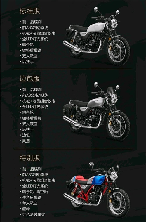 2024款CGX150系列车型作为一款小排量车型,在外观上有浓郁的复古元素,如圆形大灯、圆形后视镜以及高亮度的镀铬消音器、后制动踏脚、辐条轮毂以及后扶手等,凸显出复古车型的精致感与金属感。但3款车型也是有所区别的,其中,标准版采用银黑相间的涂装,边包版的外观在标准版的基础上配备原厂边包和车头小风挡,特别版整车采用红色和蓝色相间的撞色涂装,同时还配备有单鞍座+驼峰设计座椅、复古手把后视镜以及辐条轮辋等,让整车散发强烈的复古感和力量感。