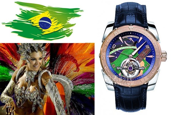 帕玛强尼推出的这一款腕表,其实是为了向巴西足球致敬。但是,这款腕表却选用了巴西的桑巴融入到腕表的设计当中。腕表的主要色调选用了巴西国旗的颜色,色彩鲜明的蓝色、黄色和绿色,十分具有冲击感。表盘上的形状,是一把吉他,使人很自然的联想到巴西热情的沙滩和奔放的桑巴。
