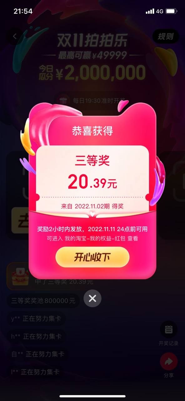 前几天活动已经进行了灰度测试,参与人数众多。开奖页面显示,11月2日晚,已有来自安徽省、重庆市的多位幸运儿拿到10000元大奖。