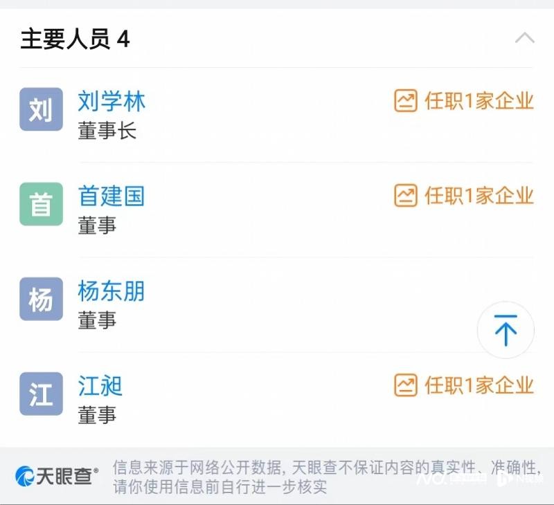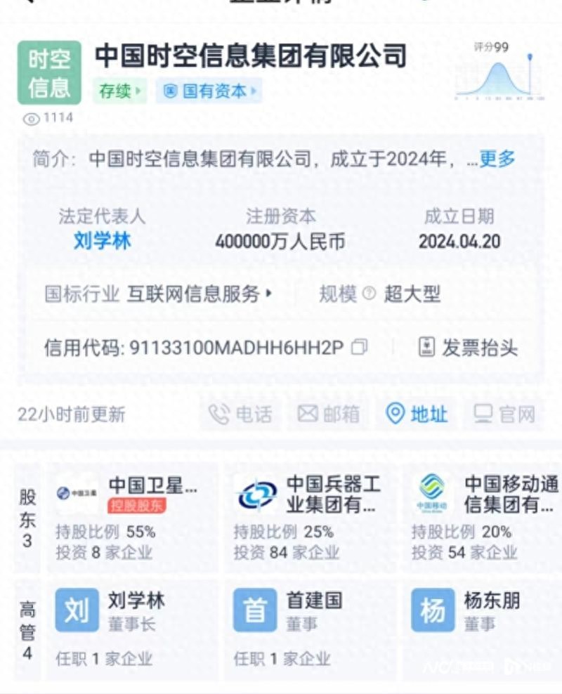 南都湾财社记者检索发现,中国时空信息集团有限公司的高管人员为刘学林任董事长,首建国、杨东明、江昶任董事。其中刘学林为中国卫星网络集团副总经理,首建国曾任中国移动市场经营部总经理。