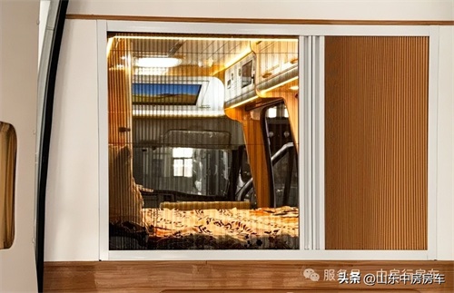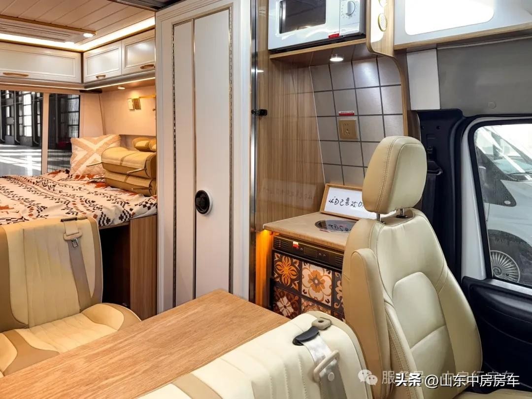 5.5米车身内,大床、独立卫浴、实木家具与纳帕皮革包覆,诠释移动之家的从容。