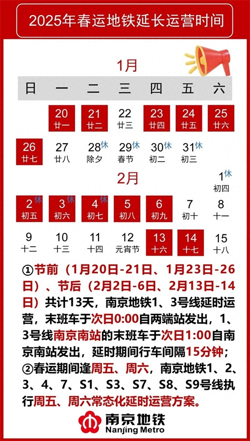 为做好南京站、南京南站主要铁路枢纽的客流衔接,节前(1月20日-21日、1月23日-26日)、节后(2月2日-6日、2月13日-14日)共计13天组织地铁1、3号线延时运营,末班车于次日0:00自两端站发出,1、3号线南京南站的末班车于次日1:00自南京南站发出,延时期间行车间隔15分钟;另为方便乘客的晚间出行,春运期间逢周五、周六,南京地铁1、2、3、4、7、S1、S3、S7、S8、S9号线执行周五、周六常态化延时运营方案。