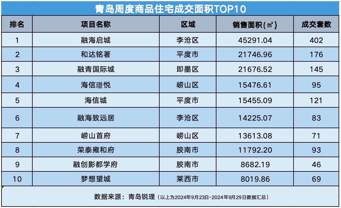 青岛周度商品住宅成交面积TOP10 数据来源:青岛锐理