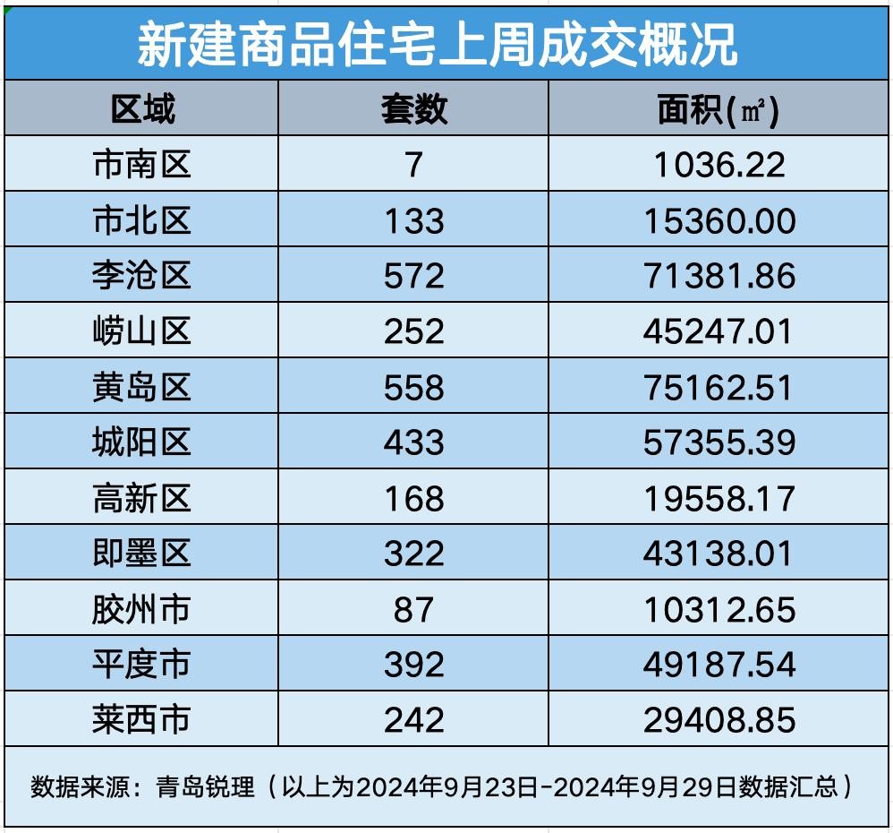 上周青岛各区市新建商品住宅成交数据统计 数据来源:青岛锐理