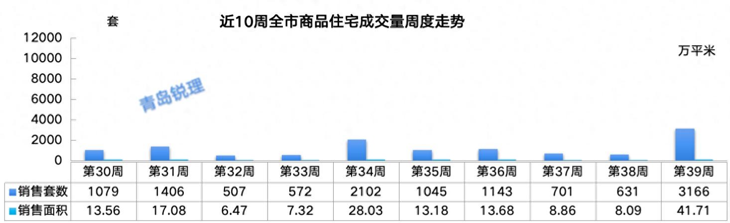 根据青岛锐理、青岛网上房地产网等机构发布的数据显示,2024年第39周,全市新建商品住宅成交量为3166套,成交面积41.71万平米,两项数据均创年内次高。全年最高点出现在第26周,成交套数为8572套,成交面积为111.43万平米。