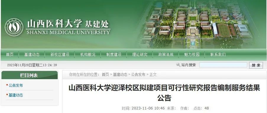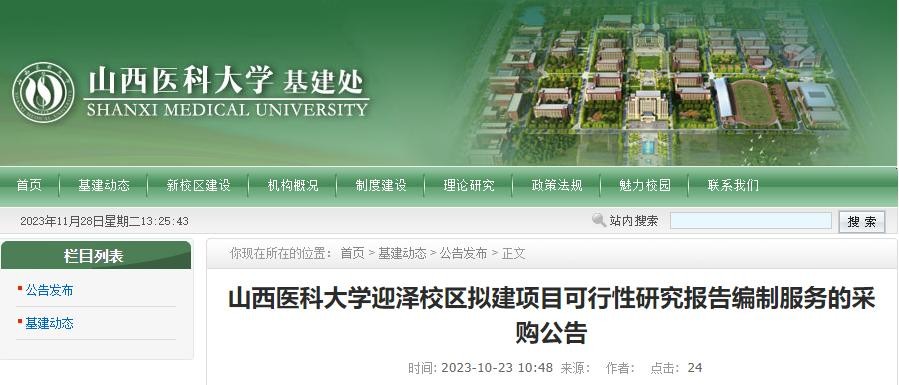 今年10、11月份,山西医科大学发布“关于山西医科大学迎泽校区拟建项目可行性研究报告编制服务的采购公告”“关于山西医科大学迎泽校区拟建项目可行性研究报告编制服务结果公告”。