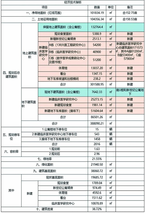 据经济技术指标表显示,规划后的总建筑面积为388090.21平方米,地上建筑面积为301588.95平方米,地下建筑面积为86501.26平方米。规划停车位为2016辆,其中公寓楼地下停车位15辆,新建临床医学研究中心地下停车位543辆,操场下地下车库停车位1458辆。绿化面积为21940.5平方米。