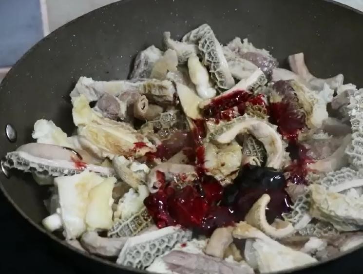 用锅铲翻拌均匀,然后加入温开水,没过牛杂即可,