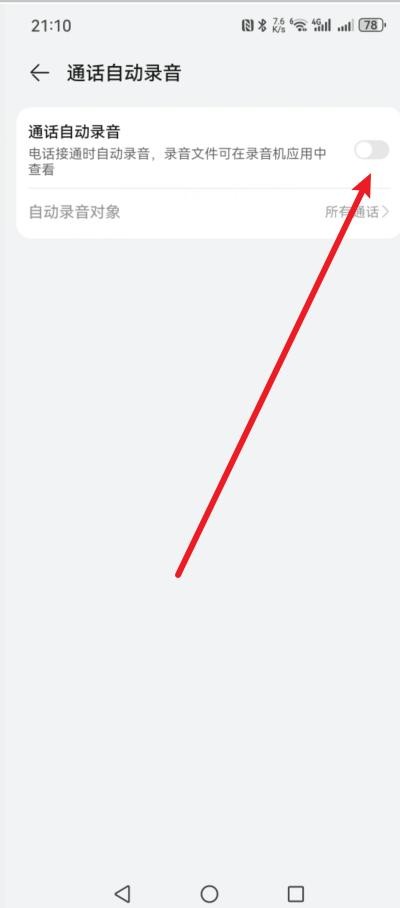 第五步:最后点击右侧的开关按钮就可以打开自动录音功能,能看到提示“电话接听时自动录音,录音文件可以在录音机应用中查看”,如下图所示: