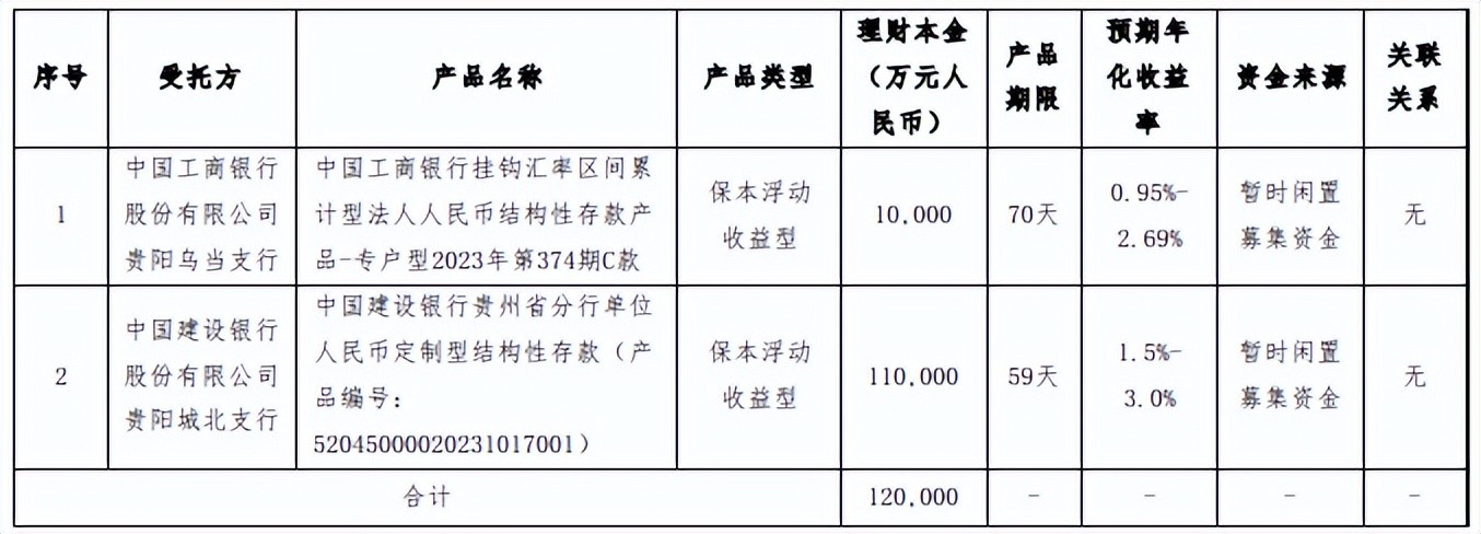 公告披露,近日,公司在中国建设银行股份有限公司贵阳马陇坝支行开立现金管理专用结算账户。公司使用暂时闲置募集资金12亿元购买银行结构性存款产品。