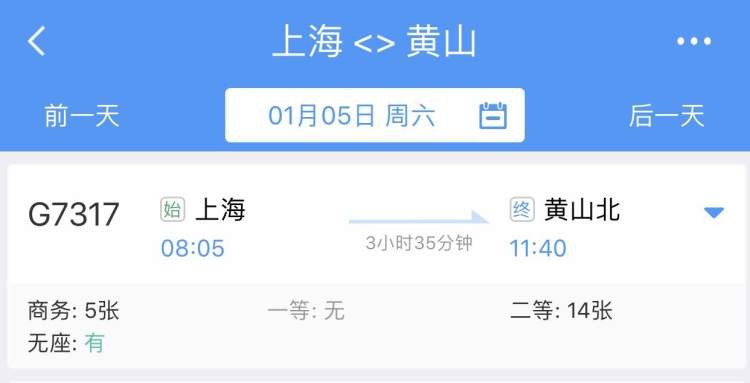 1月5日调图后,杭黄高铁启用正式运行图,上海至黄山新增10趟高铁,其中上海站2趟,上海虹桥站8趟。最早一趟G7317次列车, 8:05从上海站始发。