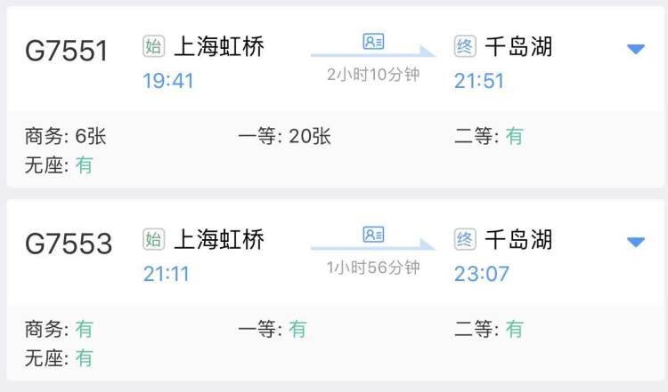 此外,上海虹桥站增开2趟终到千岛湖站的始发列车,分别为G7551次(19:41开)、G7553次(21:11开)。