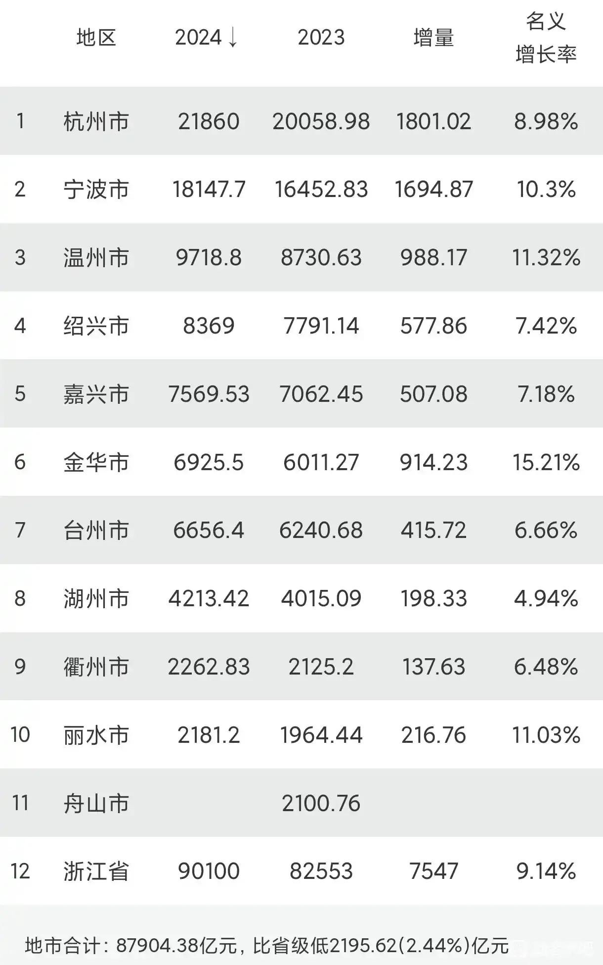 浙江省是我国经济第四大省,2024年GDP实现90100亿元,较去年增加了7547亿,名义增长9.14%,经济增量在已出炉省份中仅次于江苏省,位居全国第二名,截止目前,除了舟山暂未更新2024年GDP数据外,其余各市GDP数据都已经出炉了,从各市增速来看,金华名义增速最高,而湖州名义增速垫底。