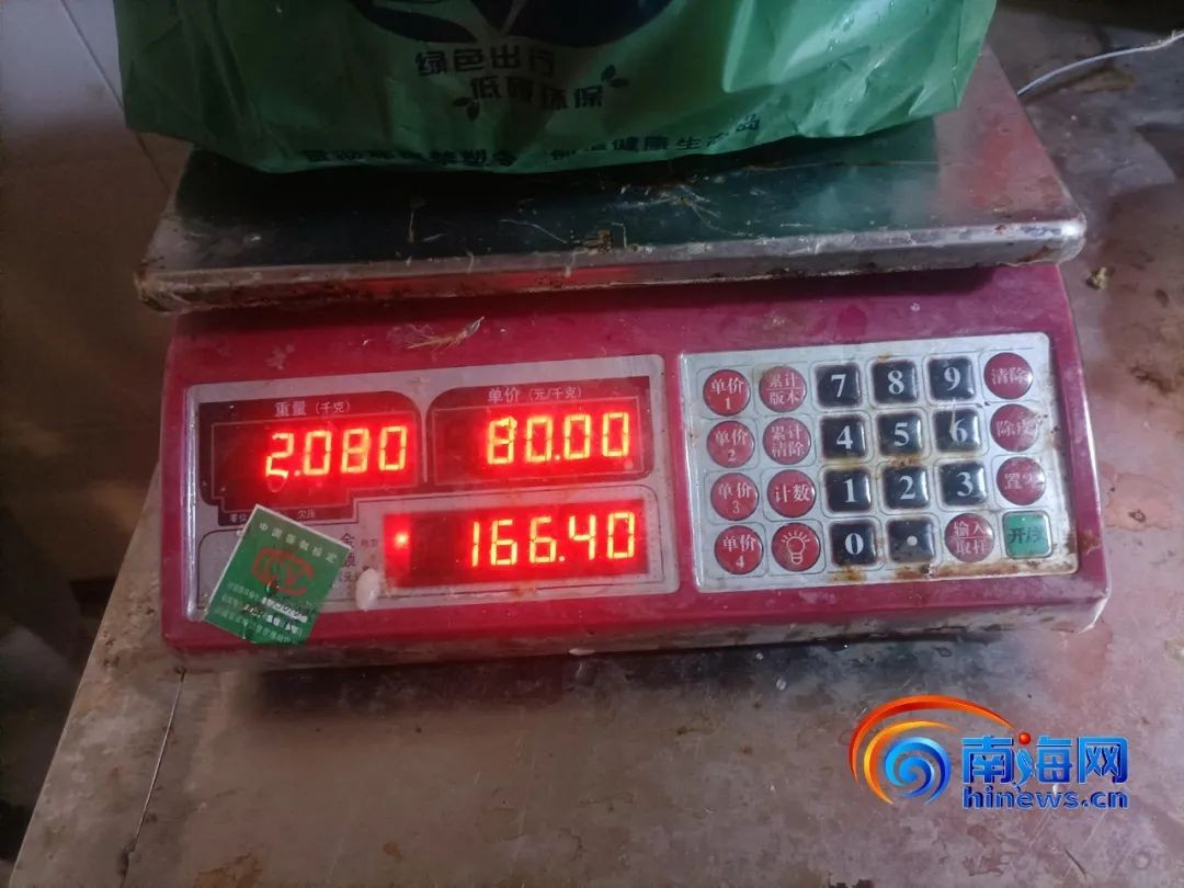 经海口市市场监管局调查核实,“阿欢海鲜”水产摊破坏计量器具准确度,以作弊方式称量商品,在该案件中,共向消费者销售海鲜4560元(实付4500元),少秤4.82公斤,违法所得696.4元。