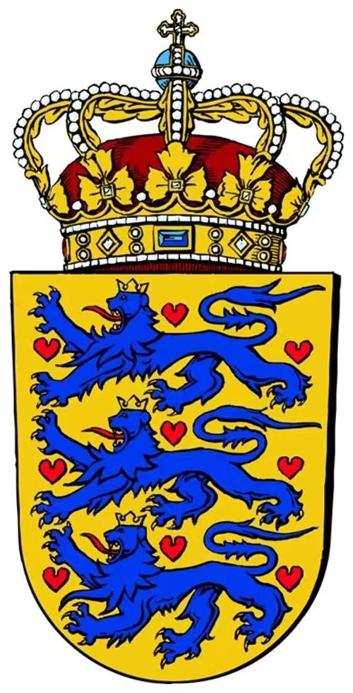 国徽:为盾徽。三只头戴王冠的蓝色狮子横置于盾面,九颗红心点缀周围,象征勇敢、忠诚和善良。盾形上端的王冠象征丹麦为一个古老的王国。