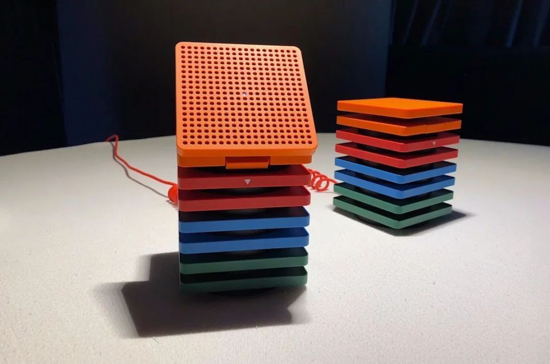 和传统智能音箱的圆柱体设计不同,渡鸦这款取名Raven-H的产品采取了一种堆叠式模块设计,最上面的模块可以拆卸,具备独立的触控、显示、语音和遥控功能。此外,音箱的电源线采用复古固定电话绳设计,全身上下也找不到喇叭开口,这种设计上的独特性贯穿了产品的各个部分。