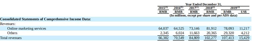 千万的销售额成为现实,翻开百度19年的财报,其收入构成被粗暴地分为两部分。在线营销服务(Online marketing services)包括搜索和feed信息流,其它业务则一律被归为“Others”的项目中。