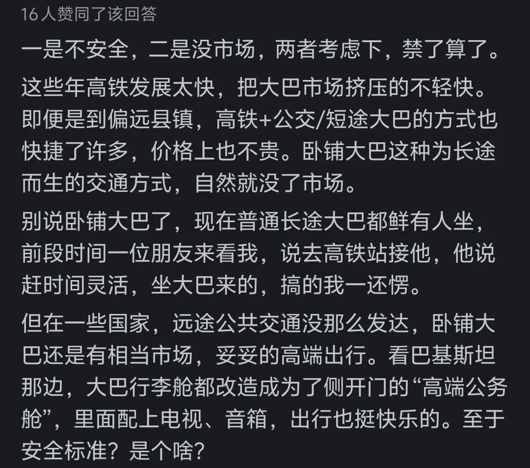 总之,中国对卧铺大巴车的全面封禁是一项基于多方面考虑的综合性决策,旨在实现交通安全、服务质量、环境保护和行业发展的多赢局面。
