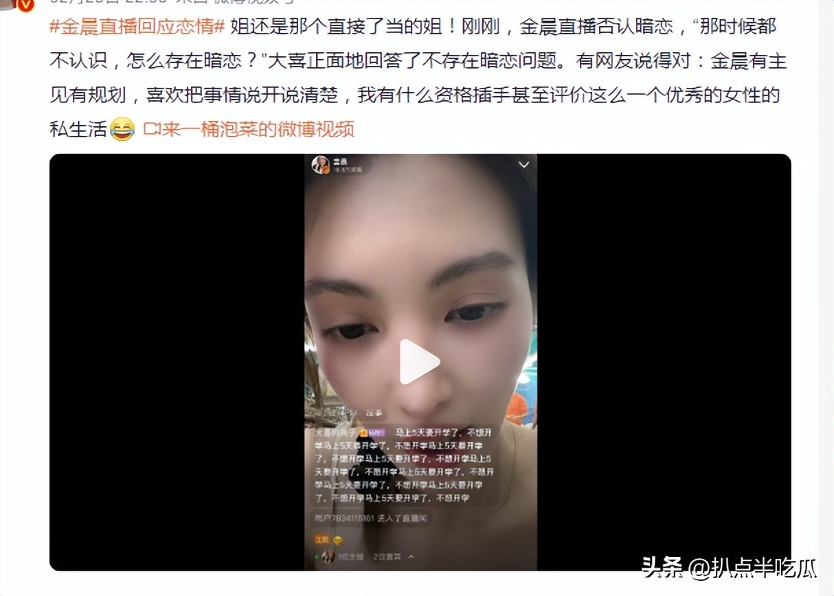 最近的消息是金晨直播中回应了男方的“暗恋文学”,直言:“当时都不认识,怎么存在暗恋?”