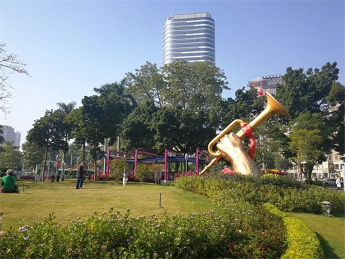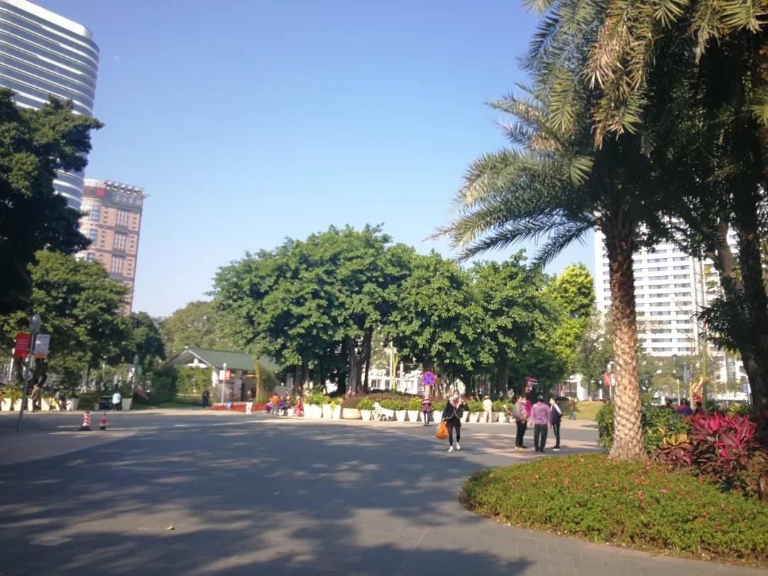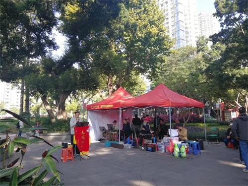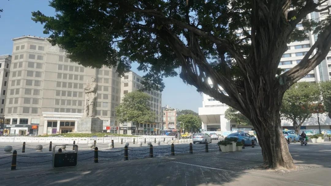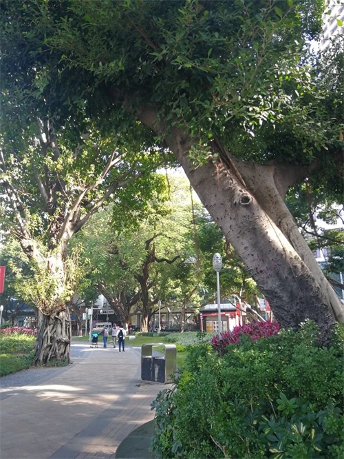 广场也是居民休闲娱乐的场所,从公交站下来走进去就看见一个粤语班组——春风曲社正在演奏歌曲,南风曲调在大榕树底下飘荡竟是那么地和谐。