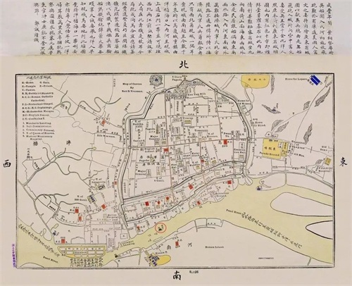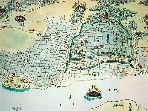 △19世纪末西方人士用西洋测绘法绘制的《广东省城图》,红圈内为海珠石位置。