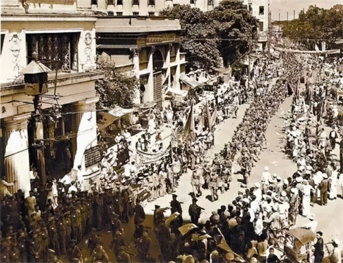 △解放军入城部队经过广州长堤。