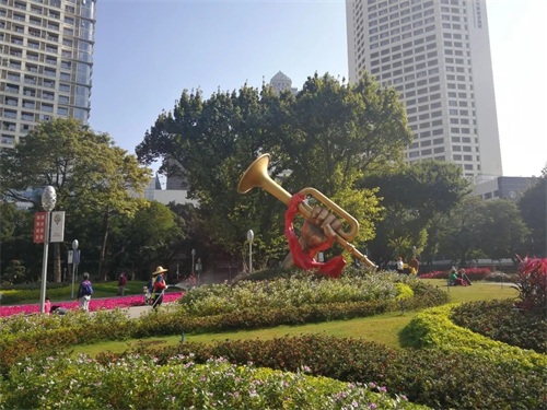 在广场中心绿化上我见到有一个手拿冲锋号的雕塑。