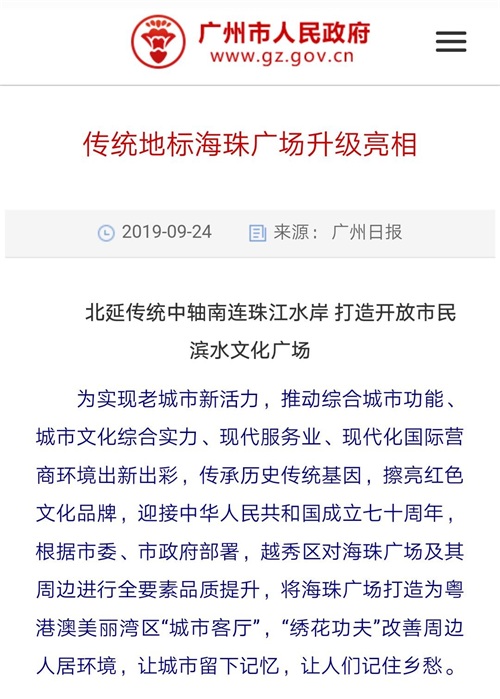 为实现老城市新活力,推动综合城市功能、城市文化综合实力、现代服务业、现代化国际营商环境出新出彩,传承历史传统基因,擦亮红色文化品牌,迎接中华人民共和国成立七十周年,根据市委、市政府部署,越秀区对海珠广场及其周边进行全要素品质提升,将海珠广场打造为粤港澳美丽湾区“城市客厅”,“绣花功夫”改善周边人居环境,让城市留下记忆,让人们记住乡愁。