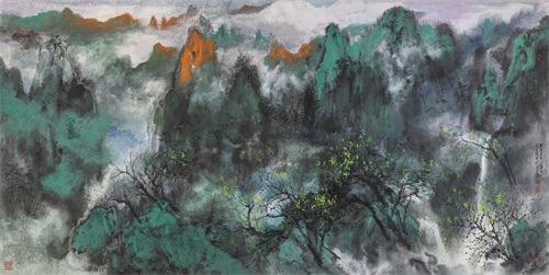 著名青年画家李泽多次在省级和国家级的展览中入选获奖,取得了不少成绩。作品《神山圣水》《快雪时晴》《仁山智水》更是在一个月内连续折桂全国美展,使他刚过而立之年就荣为中国美术家协会会员。但他依然不骄不躁,写生创作的步履始终不停,立志“写遍青山拂衣去”,足迹踏遍了大江南北。从奇石林立、飞瀑流泉、云海雾涛的《雁荡山系列》到重峦叠嶂、幽谷翠岭、钟灵毓秀的《太行山系列》,再到雪山圣域、茂草疏林、七彩高原的《祁连山系列》,他始终在笔墨之间歌颂着祖国的大好河山。“横看成岭侧成峰,远近高低各不同”,水墨交融之间,绚丽多彩、赏心悦目的自然美景跃然纸上,具备典型传统中国水墨山水画特色的佳作,设色厚重饱和,皴擦参差有致,形态各异,美不胜收。