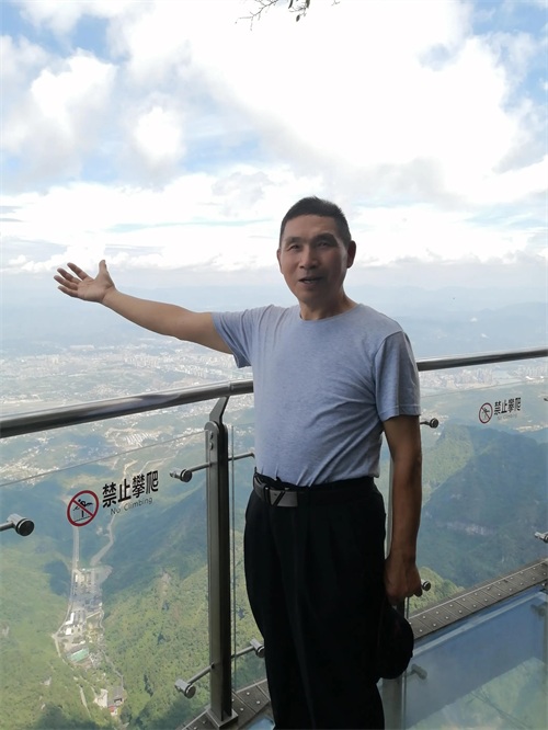这是在天门山玻璃栈道上留影,在这玻璃栈道上行走需要胆识和勇气,胆小的人很害怕,特别不敢向脚下悬空望!